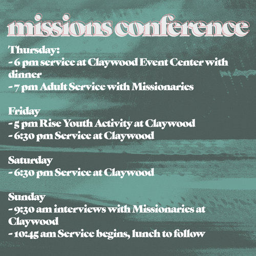 Jesus commands us in Matthew 28:19: “Go therefore and make disciples of all nations.” Now is the time to step out in faith and be part of His great mission! We invite you to a four-day Missions Conference filled with inspiring speakers, powerful worship, and opportunities to learn how you can impact the world—locally and globally. Whether you're called to go, send, pray, or support, this conference will equip and encourage you to be part of God’s work among the nations.
